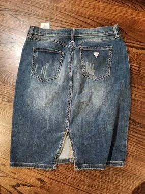 Fitted denim pencil skirt with front button placket. Distressed detailing for a casual, lived-in look. Front pockets and subtle whiskering add character. Classic mid-blue wash for versatile styling.