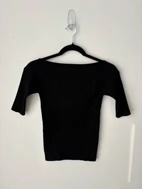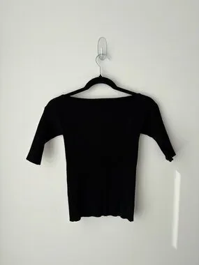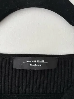 Beautiful Max Mara Weekend ribbed knit top in classic black. Features a flattering boat neckline that can be worn off the shoulder, with a fitted stretch silhouette and elbow-length sleeves. Elegant, minimalist piece perfect for a chic capsule wardrobe.