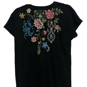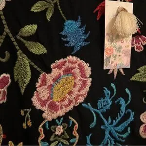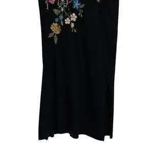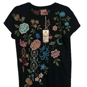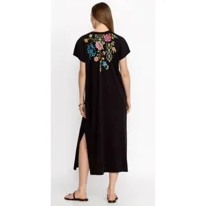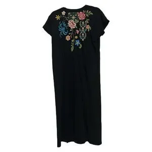 NWT, Size: XS, Color: Black/Multi, Boho, Vibrant placement floral embroidery at the front and back, Crafted from 100% super soft cotton knit, Classic midi t-shirt dress, Rounded neckline, Capped raglan sleeves, Slightly oversized, Relaxed-fit, Side slits, Pullover styling, 100% Cotton, Machine washable