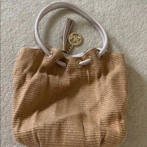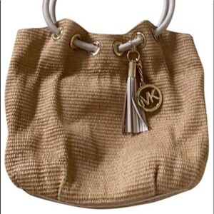 Michael Kors Straw bag with off white leather and gold MK logo and tassel