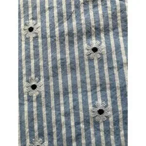 Blue and white stripe button front top from Loft. Floral daisies throughout, decorative ruffles on the standing collar and cap sleeves. Made from 100% Cotton.