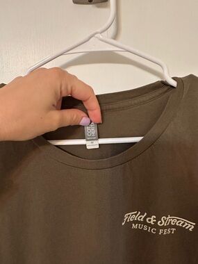 Soft olive green tee with small tan Field & Stream music logo. Casual short sleeve. Easy to style for everyday wear.