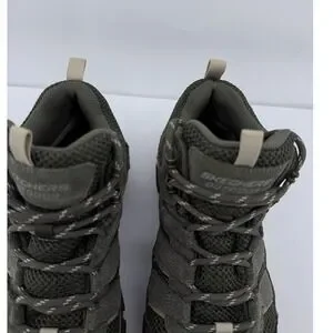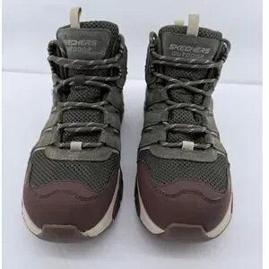 Skechers Relaxed Fit Glide-Step Outdoor boots provide rugged durability and comfort for any trail. These waterproof hiking boots feature an Air-Cooled Memory Foam insole for superior cushioning and a Glide-Step geometric midsole designed to provide natural momentum with every step. The olive green upper is constructed from a mix of leather and breathable mesh, reinforced with synthetic overlays at the toe and heel for added protection. A lugged rubber outsole ensures reliable traction on uneven terrain, while the lace-up closure with metal hardware offers a secure, adjustable fit.