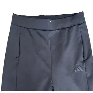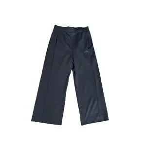 The product is a pair of women's Adidas wide leg pull on pants in size large. These black pants feature a comfortable stretchy material and a convenient pull on closure for easy wear. The wide-leg style offers a trendy and flattering silhouette, perfect for everyday wear or for hitting the gym. The Adidas brand adds a popular touch to these stylish and versatile pants. Front zipper handpockets.