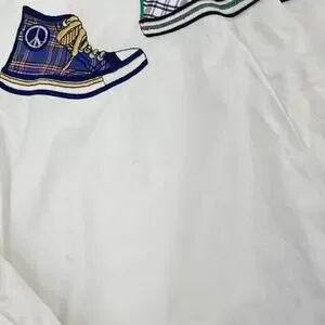 This playful vintage button-down features three embroidered plaid converse style sneakers across the chest—each with unique details like peace signs and star emblems for a fun, retro touch. It has a relaxed fit with a slightly longer length, perfect for styling tucked, tied, or worn loose as a layering piece.