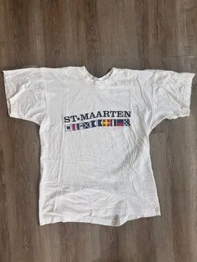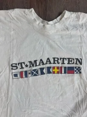 Vintage white short-sleeve tee featuring bold "ST. MAARTEN" text and a row of colorful nautical flag graphics. Easy crew neck and classic silhouette. Casual graphic shirt with maritime theme.