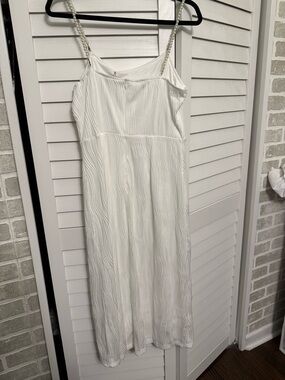A sleek white midi dress with pearl spaghetti straps will be the most comfortable thing you wear. It is made from soft textured fabric with a flattering silhouette and a well placed slit. Perfect for evening events or special occasions, and perfect for a wedding shower. Brand new with tags, never worn, size M, fits a size 6-8 and fabric is very flexible for fit.