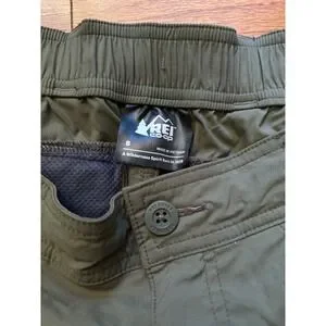 This pair of REI Convertible Hiking Pants come in a Size 8. The forest green material is made with nylon, and spandex.