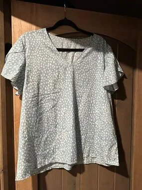 Airy light blue blouse with a subtle white spotted print. V-neckline for a classic look. Flutter sleeves add soft movement. Lightweight and easy to style.