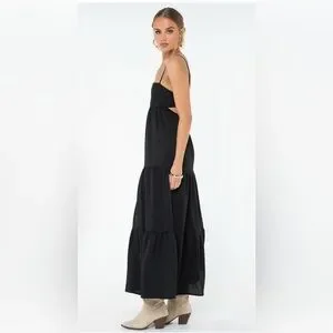 Elegant black maxi dress with thin spaghetti straps. Square neckline and fitted bodice. Flowing tiered skirt creates soft movement. Minimal, versatile design for day or night. Simple and chic styling.