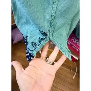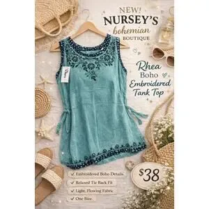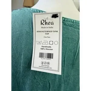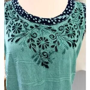 NWT Rhea handmade boho embroidered tank top in a beautiful teal green. Features intricate floral embroidery at neckline, contrast patterned trim, and a flattering relaxed fit with adjustable tie-back detail. Lightweight breathable fabric perfect for summer, beach days, or layering.
