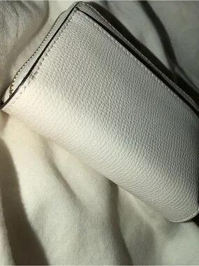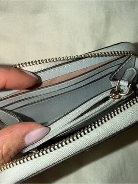 Compact pebbled leather wallet by kate spade. Gold tone logo hardware on front. Neutral white color for versatile styling. Clean, structured silhouette. Great condition. Light blue interior