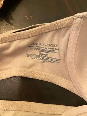 Set of two Victoria's Secret molded cup bras. Smooth cups create a seamless look under clothing. Lace trim adds subtle feminine detail. Adjustable straps for a customized fit. 34 D.