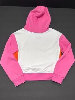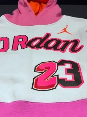 * Brief Description: Classic Jordan crewneck in white. Bold pink script branding across the front. Small orange Jumpman logo above the lettering. Sporty and eye-catching design with mesh material hood details.