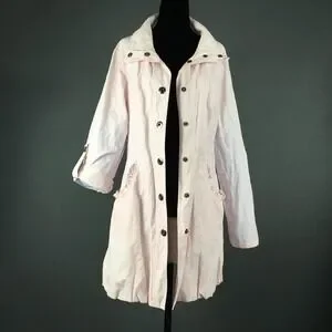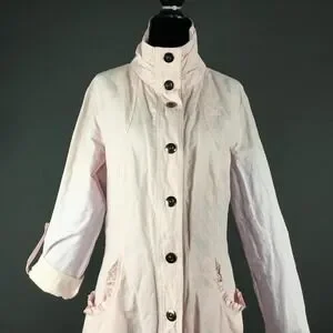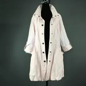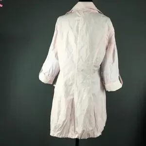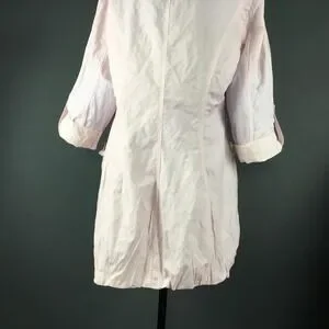 Item: Womens light pink mid length snap front jacket with roll tab sleeves.