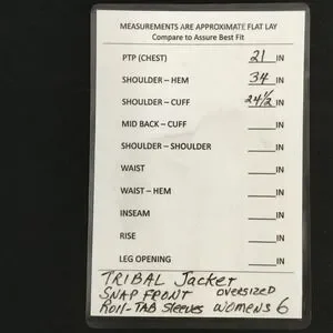 Actual measurements (per measurement card): Chest (PTP) 21 in, shoulder to hem 34 in, shoulder to cuff 24 1/2 in.