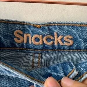 Just a nibble: SNACKS! From MOTHER takes cues from throwback styles of the '80s and '90s, reimagining them with more exaggerated shapes and extreme proportions. The slouchy, oversized jeans feature super-high rises, deep pleats, drop crotches, and inseams that puddle at the hem. Made of rigid 100% cotton, these styles channel the nostalgia of snack time with pretzel-detailed buttons and candy-coated rivets that look good enough to eat.