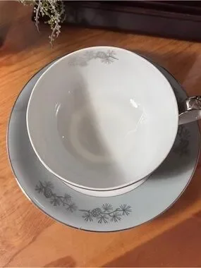 EUC! This item is a vintage Fine Seyei Toki Co. China teacup and saucer set in the "Silver Cone" pattern, featuring a gray band with platinum pinecones and trim.