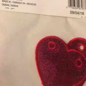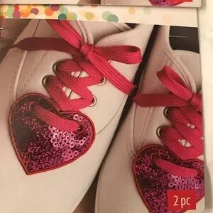 White kids sneakers with bright hot pink laces. Shiny hot pink sequin heart patches on toes. Playful and eye-catching style.