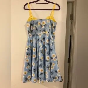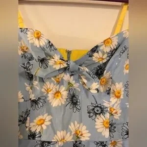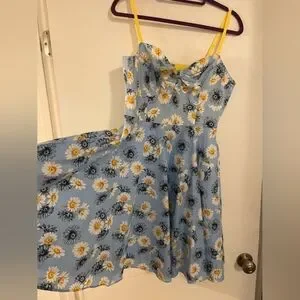Light blue sundress with white and yellow daisy print. Sweet sweetheart neckline and thin yellow straps. Flared skirt for a flattering silhouette. Bright, cheerful floral style.