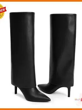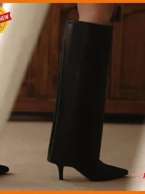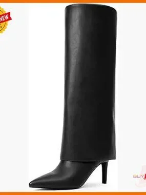 Knee High Boots Fold Over Pointed Toe Stiletto Heel Wide Calf Zipper