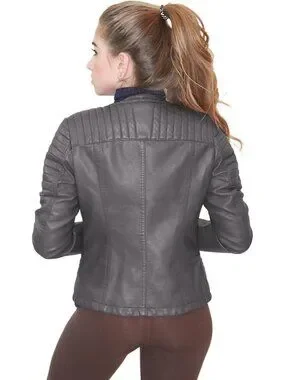 Women's Elegant Faux Leather Zip Up Moto Biker Jacket Zipper Long Sleeves Grey