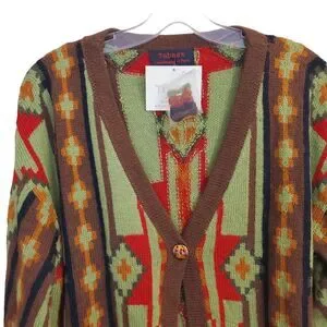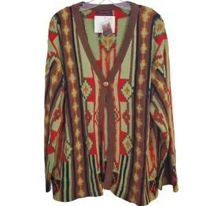 This one is New with tags, unworn. Extra yarn and button attached. Medium weight alpaca/wool/acrylic blend, comes with extra yarn and button, handmade in Peru! Rich colors (green, red, brown and muted orange), amazing southwestern/aztec pattern. Great choice for office, daily wear, travel, church