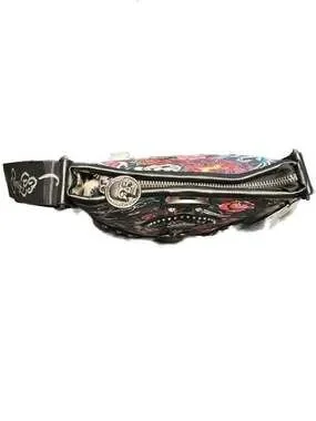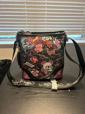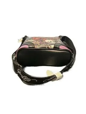 Ed Hardy Tattoo Print Skull & Roses Crossbody Bag with Rhinestone Detail