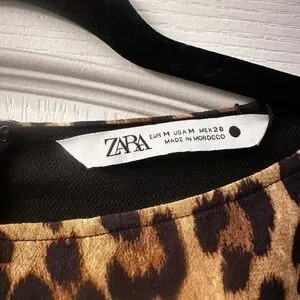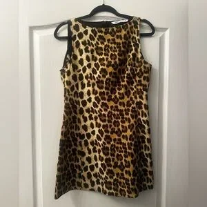 Eye-catching leopard print mini dress from Zara. Sleeveless with a straight, shift silhouette. High, clean neckline. Easy to style for day or night.
