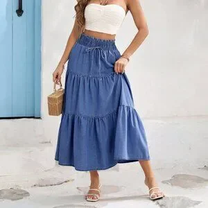Medium Wash Boho Women's Relaxed Elastic Waist Long Denim Skirt