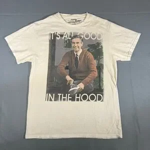 Eye-catching graphic tee showcasing Fred Rogers, featuring the playful slogan "It's All Good In The Hood." This shirt blends nostalgia with a touch of modern humor, making it a unique statement piece. The cream-colored base serves as the perfect canvas for the detailed graphic, highlighting Rogers in a relaxed pose. With its comfortable fit and casual style, this tee is ideal for everyday wear, casual outings, or themed parties. It's a great conversation starter and a fun way to pay homage to a beloved cultural icon.