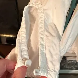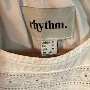 Charming white dress by Rhythm. Perfect for casual outings. Comfortable and stylish. Mini dress or tunic.~18.5” p2p. ~30.5” length. ~15” waist. Side zip. Back button closure. Button closures on sleeve. No spots or tears. Lace embroidered inlay accents on dress and sleeves. The button loops are a little tight but they are functional. Skirt is lined. Nice for multiple seasons, wear with sandals or a cute vest. Also can be styles with jean jacket and cowboy boots.