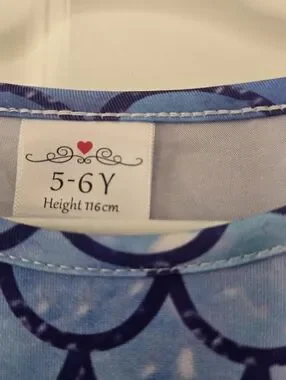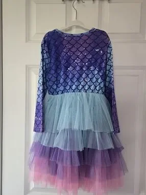 Fun mermaid-scale print bodice. Long sleeves with shimmering scale pattern. Tiered tulle skirt in blue, purple and pink. Playful, twirl-ready dress. Like new condition, smoke free home
