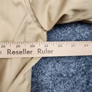 Interior and construction: Fully lined body and sleeves with tan, brown, and yellow grid check pattern and elasticized back hem for ease of movement.
