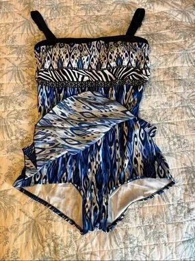 Maxine of Hollywood Blue Patterned Women’s swimsuit Black Trim SZ 16