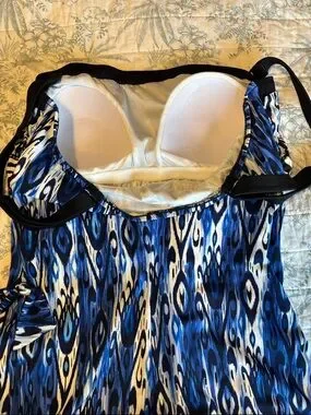 Stylish blue patterned women’s tankini top with black trim and adjustable straps. Soft, flowy fabric with an eye-catching ikat-inspired print. Designed for comfortable coverage and a flattering silhouette. Blue and black color combination works well with mix-and-match swim pieces.