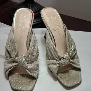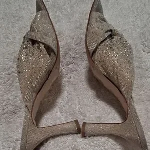 Shimmering heels with elegant knot design. Perfect for glamorous events.