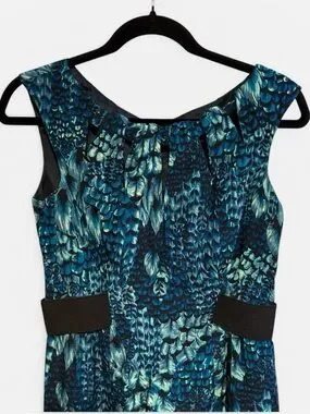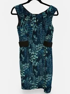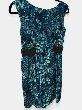 Stunning and sophisticated Nanette Lepore sleeveless sheath dress in a vibrant teal, blue, and black "peacock feather" print. Crafted from luxurious 100% silk and made in the USA.