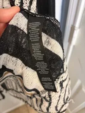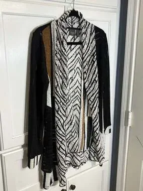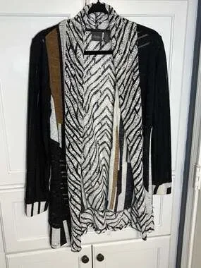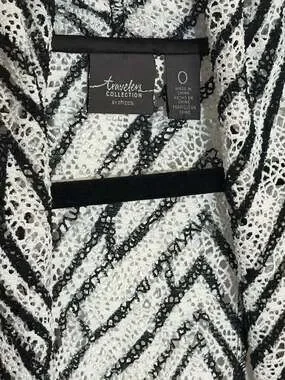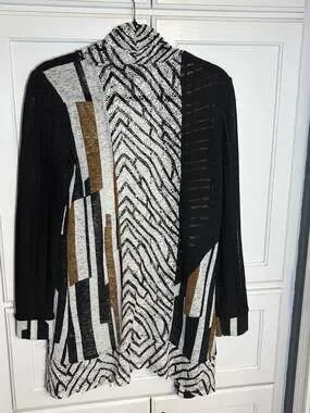 Chico's Travelers Collection open front draped cardigan in a striking geometric mixed print. This lightweight piece features a black, white, and tan color palette with a textured, airy knit design.