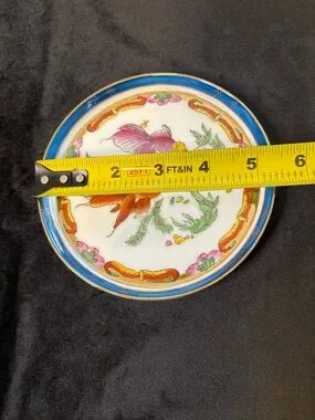 Delicate hand-painted porcelain tea set. Floral and bird motifs with cobalt blue trim. Comes in a gold patterned presentation box with satin lining. Perfect for display or gifting.