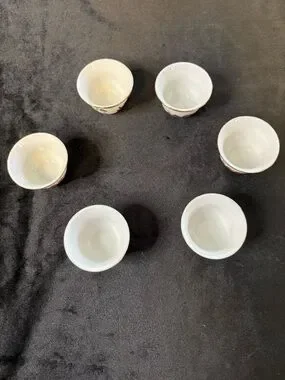 Set includes small teapot small teapot with lid, six miniature teacups, and matching serving saucer.