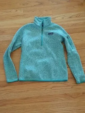 Teal fleece half-zip pullover. Sweater material on the outside and fleece on the inside. Stand collar with zip front. Zip sleeve pocket for small items. Soft textured knit with subtle speckled pattern. Great for layering and outdoor use.