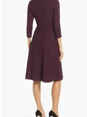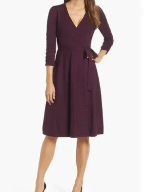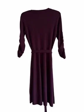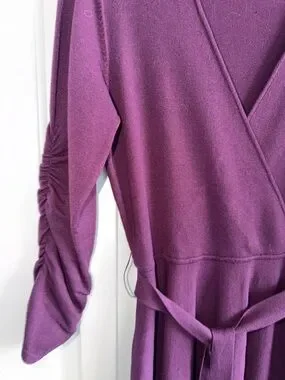 This universally flattering wrap-look dress in a drapey jersey stitch features pretty shirring at the sleeves and a removable sash at the waist.