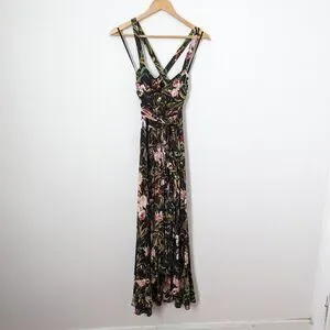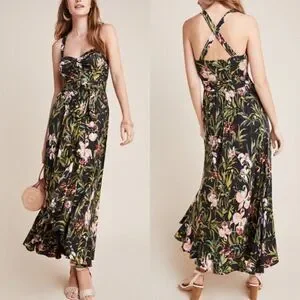 Maeve Anthropologie black green pink tropical floral Gabriela stretch maxi dress