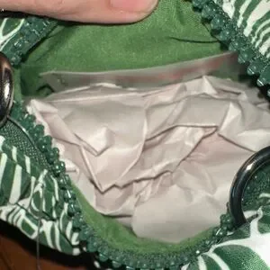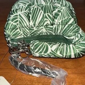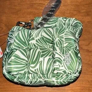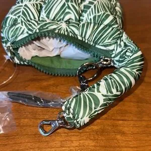 Quilted micro pouch with botanical leaf print. Green and white colorway. Toucan Tropics with Zip closure and wrist strap. Lightweight and compact. Stylish printed accessory. 4 1/2”x4”x1”