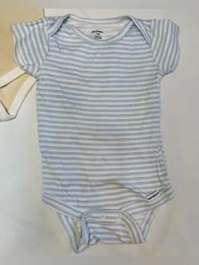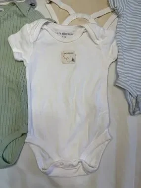 Assorted baby one-pieces in soft, breathable cotton. Includes cream, white, light blue, light green, and gray-striped pieces for easy outfit rotation. Comfortable lap shoulder necklines and snap closures for fast changes. Brands include Burt’s Bees, Gerber, Kyle & Dean.