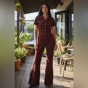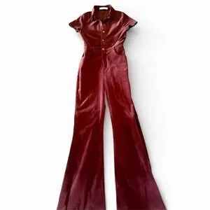 Rich velvet fabric in a deep burgundy hue. Button-front bodice with short sleeves. High waist with subtle front pockets. Flared bootcut legs for a retro silhouette.