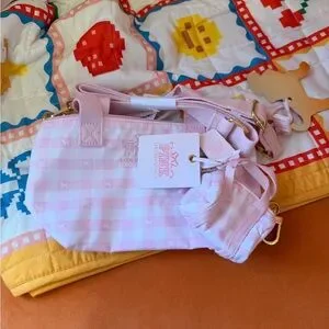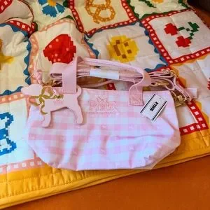 From the super cute LoveShackFancy collab with VS PINK, this mini tote is deliciously girly in a soft, pink gingham pattern dotted with little VS PINK dogs. This little tote also features gold hardware, stitched PINK and LSF logos and a detachable, adjustable strap.