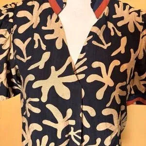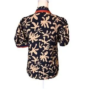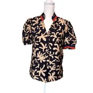 THML Puff Sleeve Blouse Black Beige Abstract Print Mandarin Collar Size S