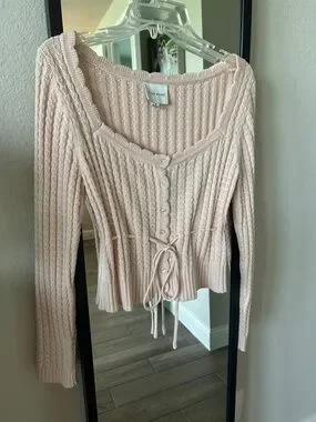 Blush knit cardigan with delicate cable texture. Square neckline and front buttons. Adjustable waist tie for a personalized fit. Long sleeves with ribbed cuffs and hem. Soft, feminine color ideal for layering.